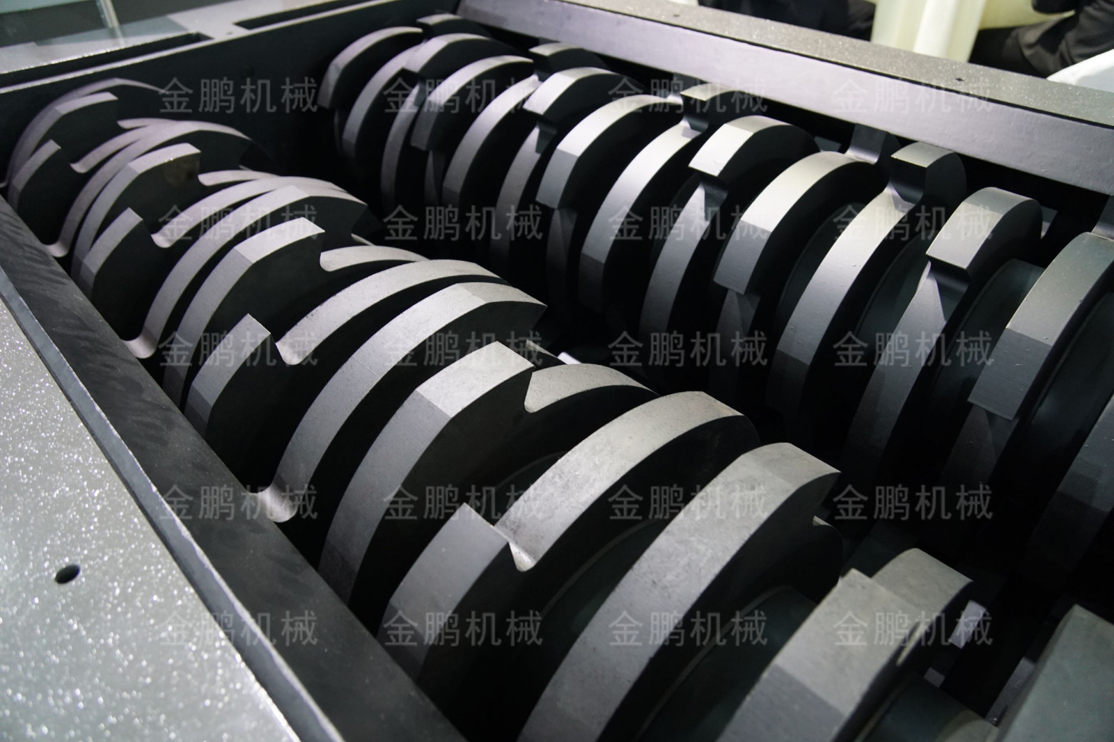 采用雙軸或單軸低速轉(zhuǎn)動(dòng),利用刀盤(pán)對(duì)物料進(jìn)行切、割、撕、拉。直連蝸輪蝸桿減速電機(jī),直接安裝在粉碎機(jī)主動(dòng)軸上,通過(guò)齒輪變速傳至從動(dòng)軸,使主動(dòng)軸的 動(dòng)刀與殼體上的靜止刀盤(pán)形成相對(duì)運(yùn)動(dòng)。主動(dòng)軸上的螺旋齒刀盤(pán)交錯(cuò)排列,使物料進(jìn)入后,同時(shí)受到擠、撕、剪的作用,從而使物料得到破碎。